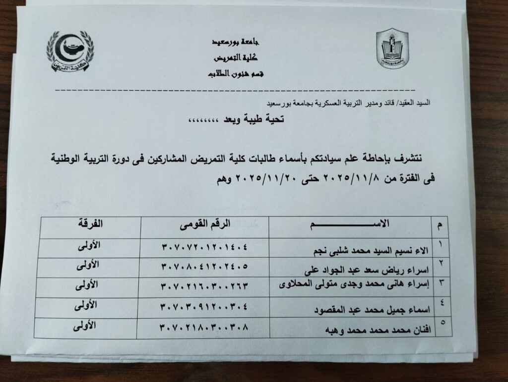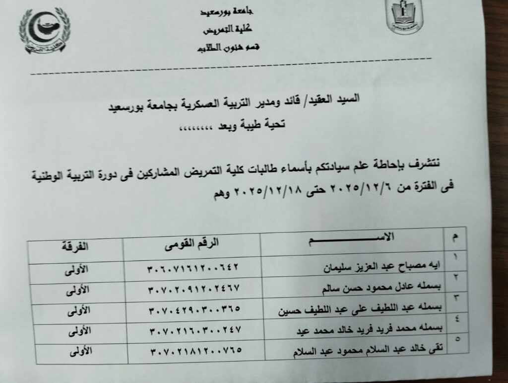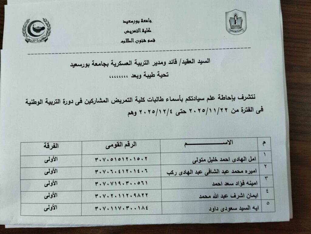 مواعيد دورات التربية الوطنية خلال الفصل الدراسي الاول ٢٠٢٦/٢٠٢٥  و كشوف الطالبات المرشحات للدورات مع العلم بضرورة ا لالتزام الاجباري للطالبات المرشحات بحضور الدورات حسب المواعيد المعلنة و استكمال التسجيل للدورات عن طريق تسليم الاوراق المطلوبة  بإدارة التربية العسكرية بكلية التجارة ببورفؤاد فورا و هي:
